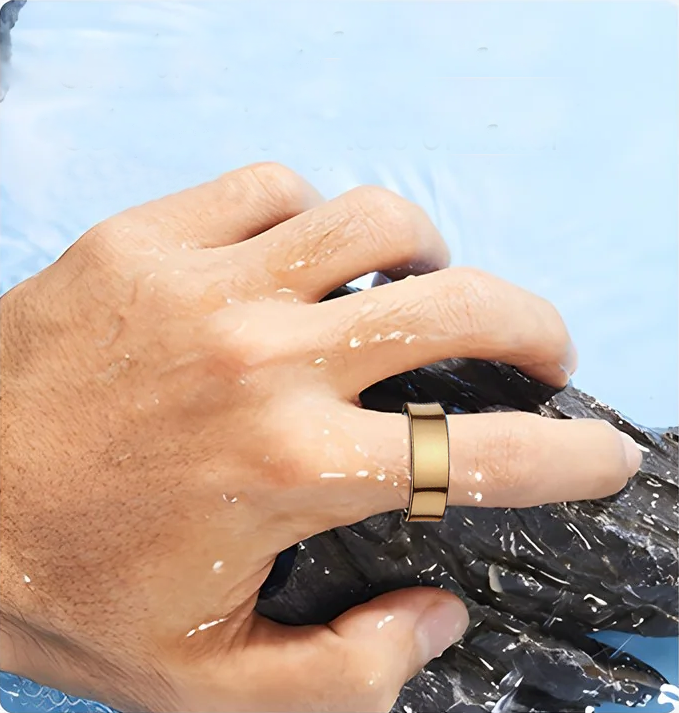 Täysin suljettu rakenne. Pystyt uimaan sormuksen kanssa eikä se hätkähdä myöskään käsienpesusta tai sateesta. Kestää vedenpaineen jopa 50 metrin syvyyteen asti.