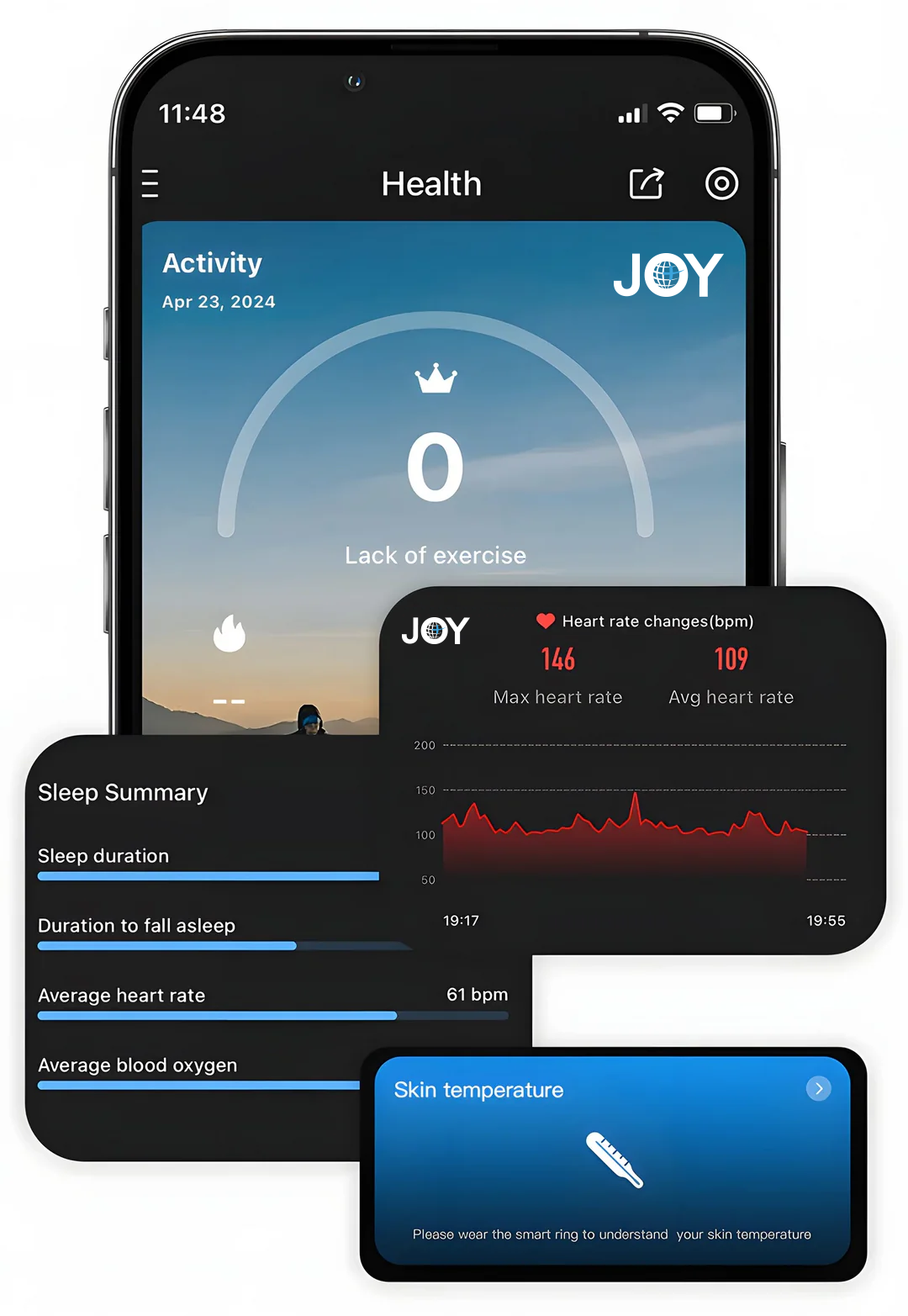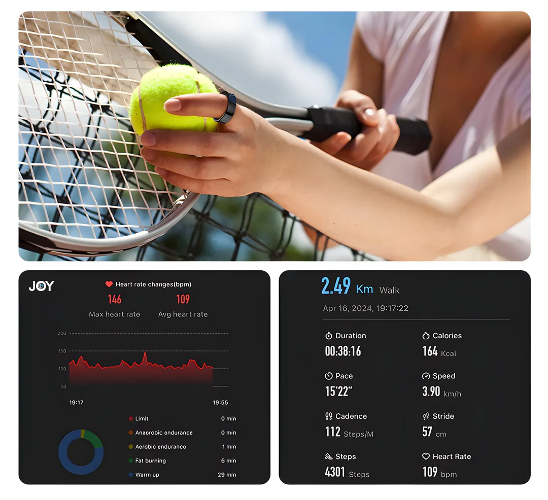 JoyR+ älysormuksen pinta on valmistettu ruostumattomasta teräksestä, ja siinä yhdistyvät poikkeuksellinen kestävyys, hillitty tyylikkyys ja erinomainen käyttömukavuus. Se sisältää useita toimintoja, kuten veren happisaturaation mittauksen, sykkeen ja unen seurannan.