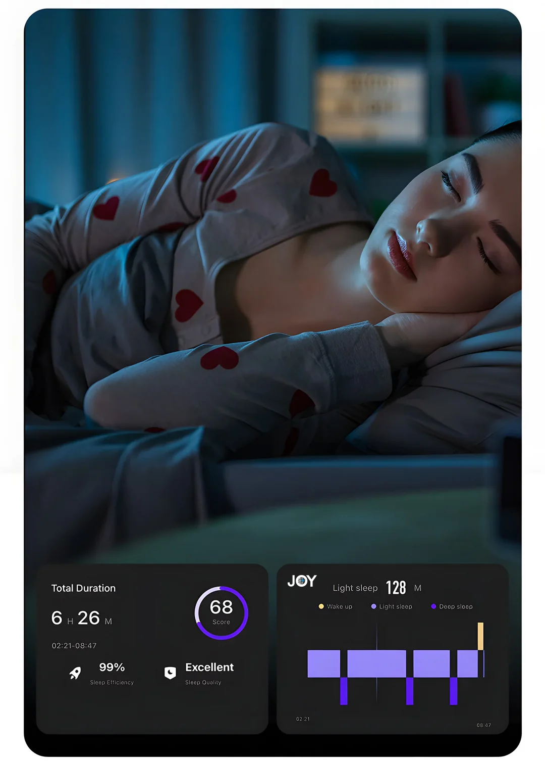Uni on kaiken hyvinvoinnin perusta! Sormuksen unenseuranta tarkkailee unenlaatuasi automaattisesti ja luo sinulle raportin joka yö. Raportissa on eritelty REM-uni, syvä uni, valveuni ja hereilläoloaika. Unenseurannan avulla kehität omia unitottumuksiasi.