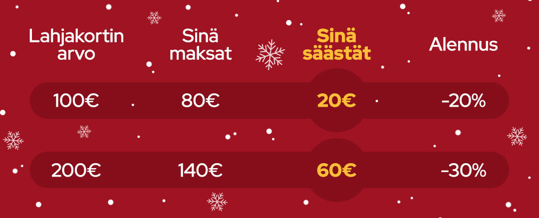 Mitä suurempi lahjakortti, sen suurempi alennus sinulle. Tarjous voimassa vain rajoitetun ajan.